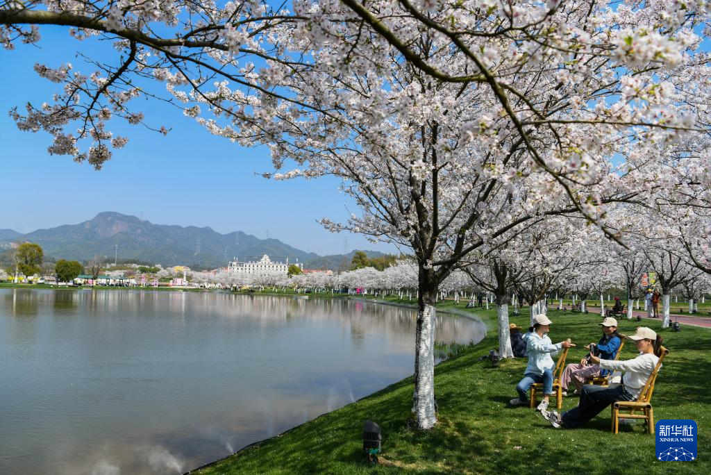 3月25日,游人在浙江省金华市武义县花田美地樱花树下休息赏景。
