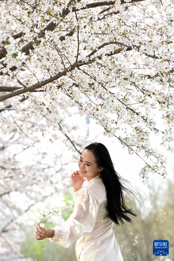 3月25日,游客在河北省石家庄市石津灌渠文化公园观赏樱花。