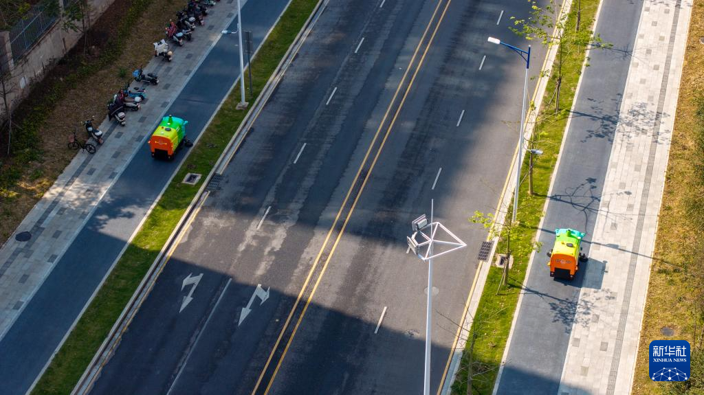 3月19日,在深圳市坪山区坑梓街道,环卫机器人在清扫街道(无人机照片)。