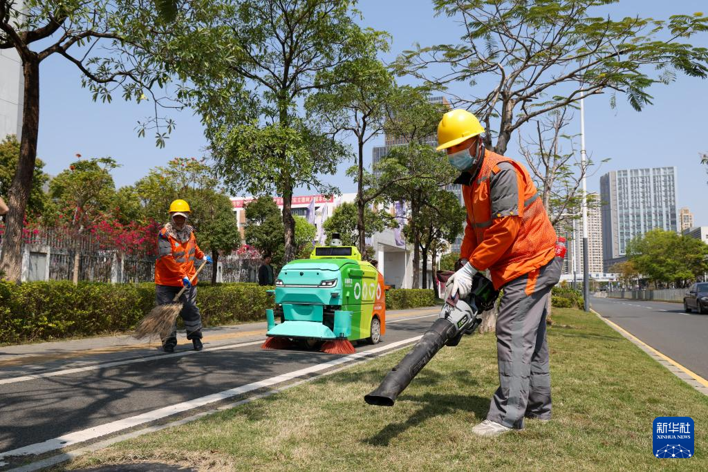 3月19日,在深圳市坪山区石井街道,环卫机器人与环卫工人进行协同作业。