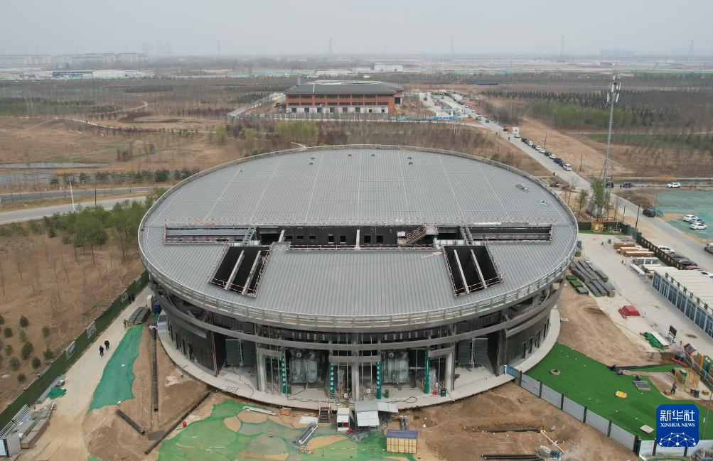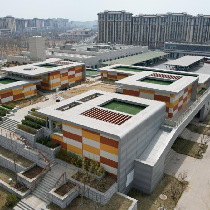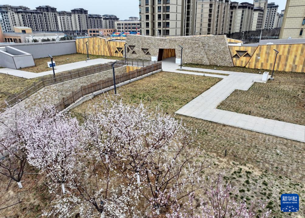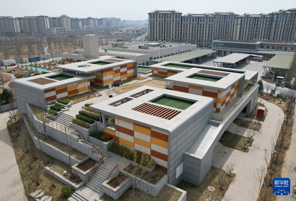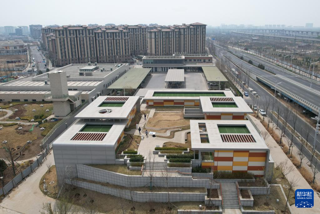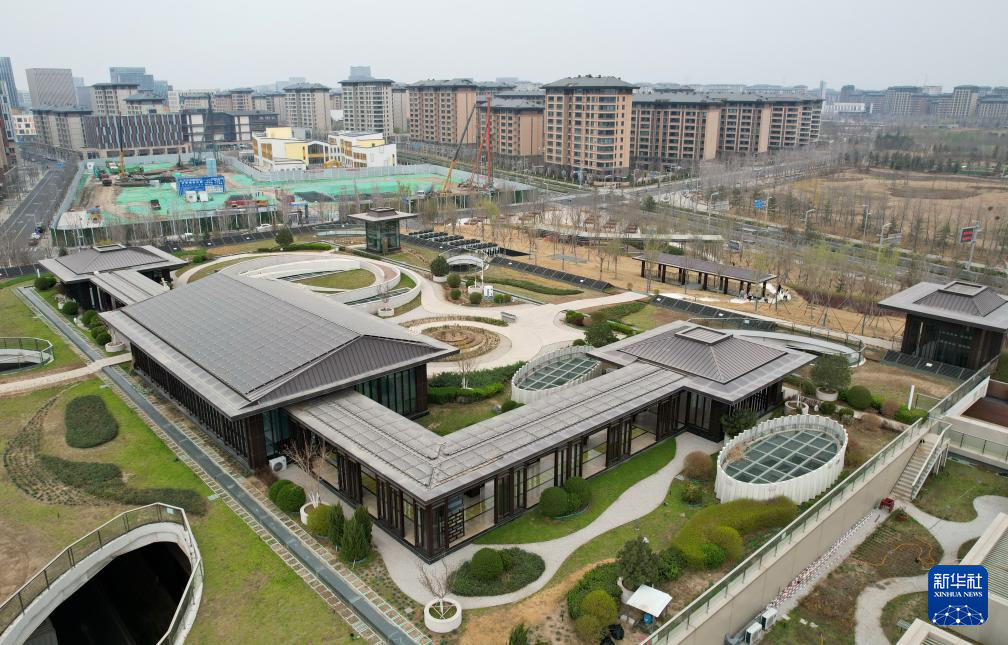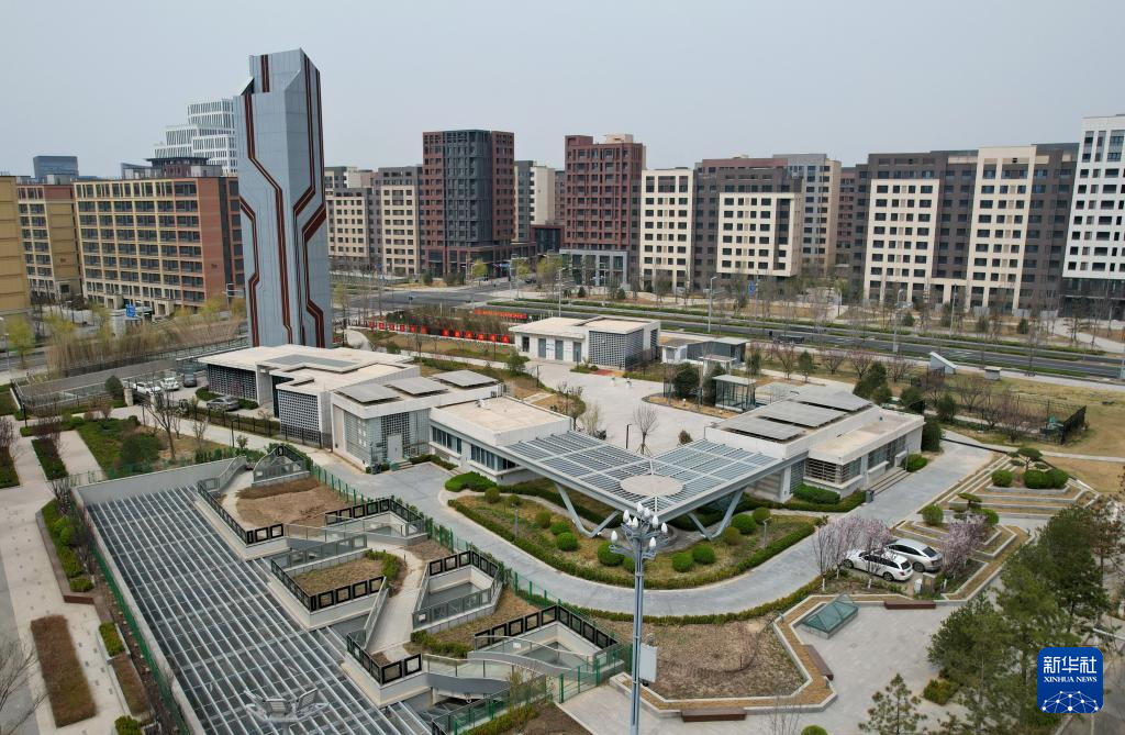 3月26日拍摄的河北雄安新区“智慧能源立方”——剧村220千伏变电站外景。该变电站屋顶覆土建设成公园,形成与城市融合共生的图景(无人机照片)。