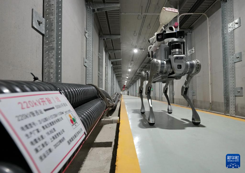 3月26日,一台四足巡检机器人在雄安新区雄东—昝西220千伏线路工程隧道进行巡检。