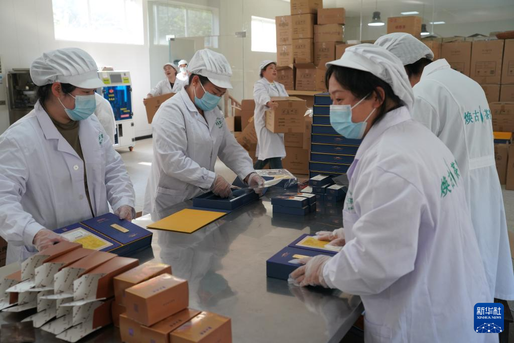 3月26日,紫阳县焕古镇一茶企工作人员在生产车间内包装茶叶。