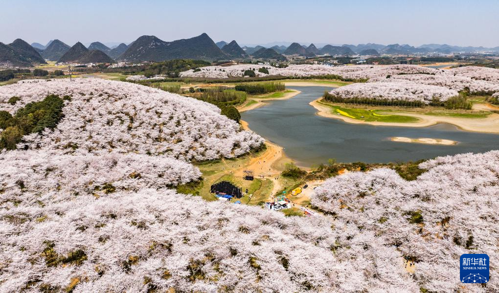 近日,贵州省贵安新区樱花园内的2.4万亩樱花迎来盛花期,吸引各地游客前来赏花游玩。