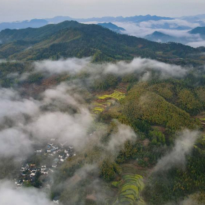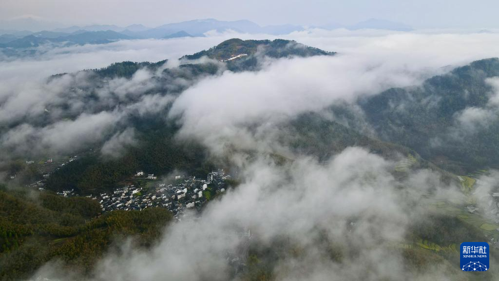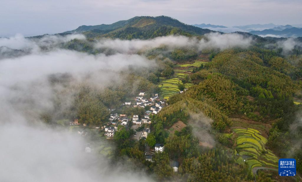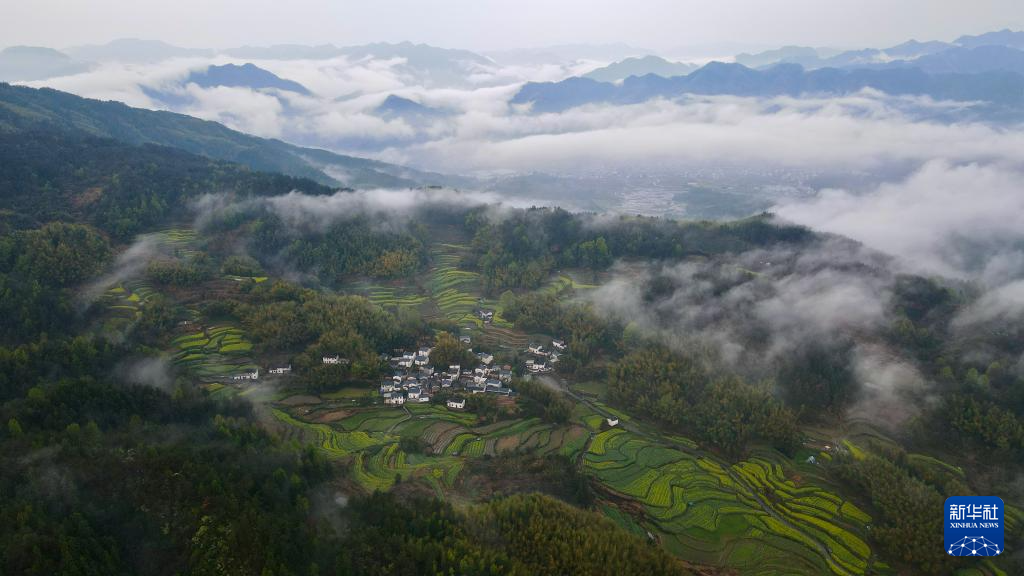 雨后初霁,位于安徽省黄山市徽州区呈坎镇的灵山村出现云海景观,缥缈的云雾与徽派民居、梯田花海相映成趣,美不胜收。