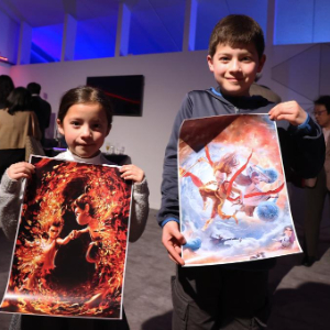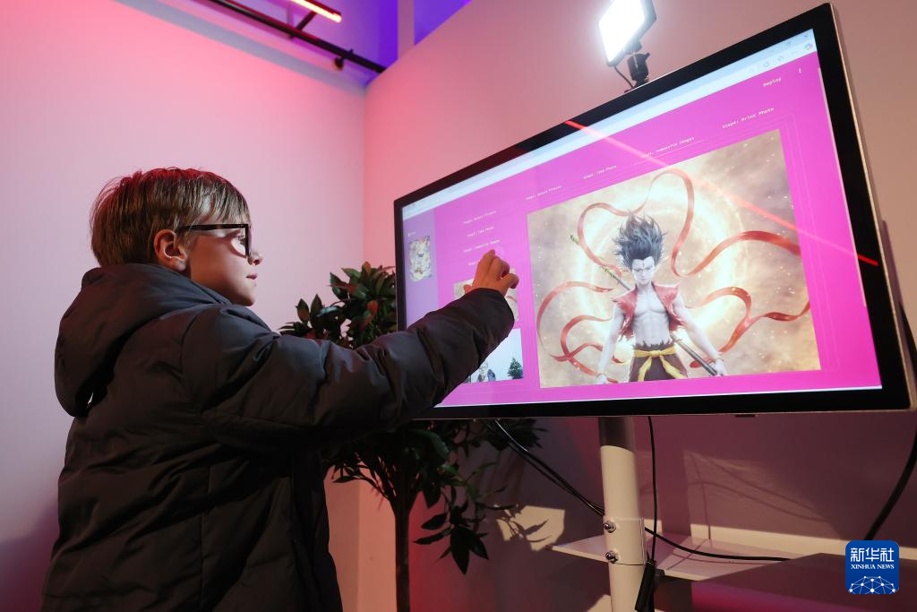 3月26日,在比利时布鲁塞尔,小朋友在《哪吒之魔童闹海》首映活动上体验“哪吒”换脸游戏。