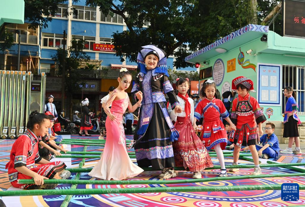 3月27日,老师和孩子们在广西南宁市民族大道东段小学跳竹竿舞。