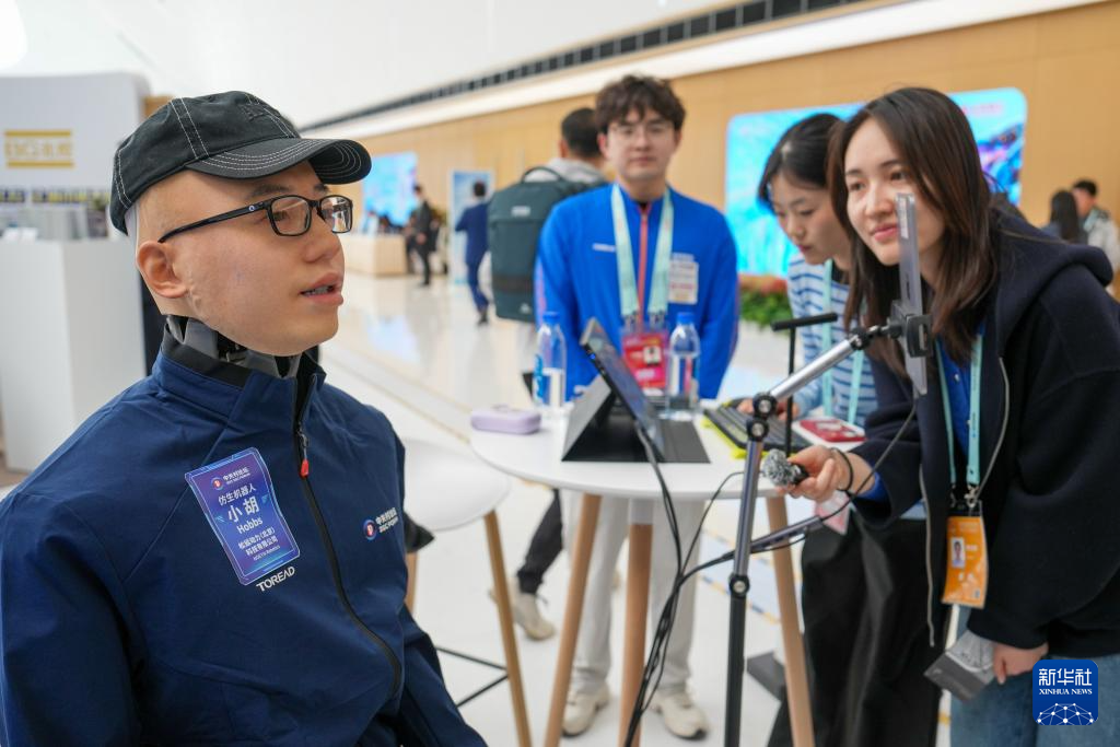 3月27日,在中关村国际创新中心,一款名为“小胡”的仿生机器人与参观者交流互动。