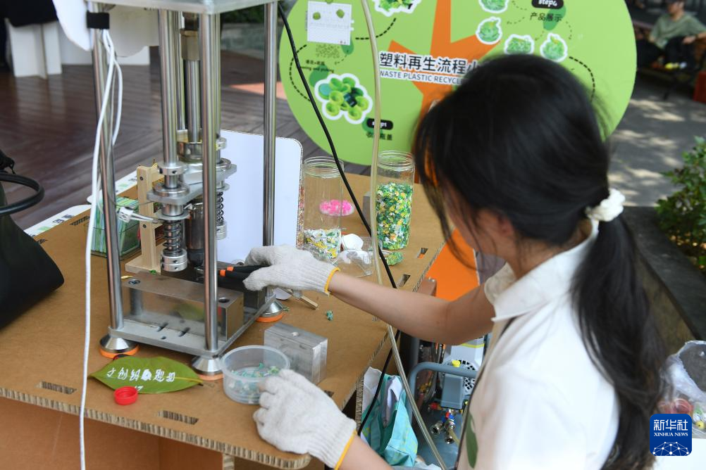 在博鳌零碳示范区内的塑料再生流程科普展台上,工作人员展示塑料再生流程(3月25日摄)。