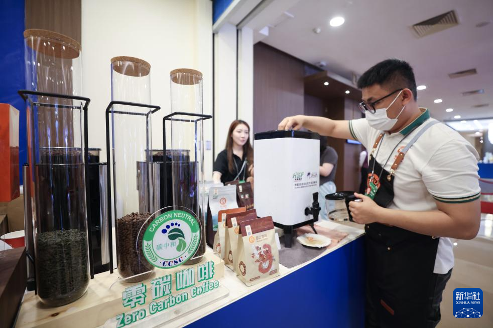 3月27日,工作人员在会场外制作零碳咖啡。