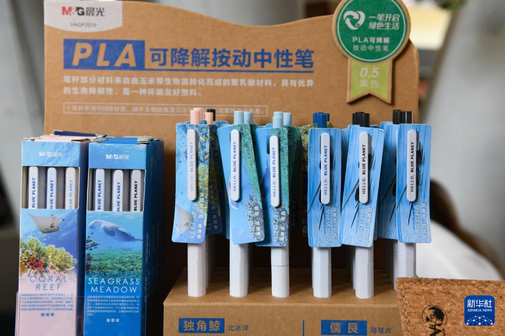这是3月25日在博鳌零碳示范区内展示的可降解按动中性笔。