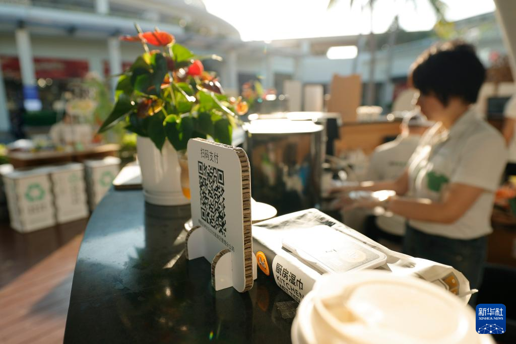 3月26日在博鳌亚洲论坛2025年年会会场外的休息区拍摄的支付码。支付码印在可再生纸制作的纸板上。
