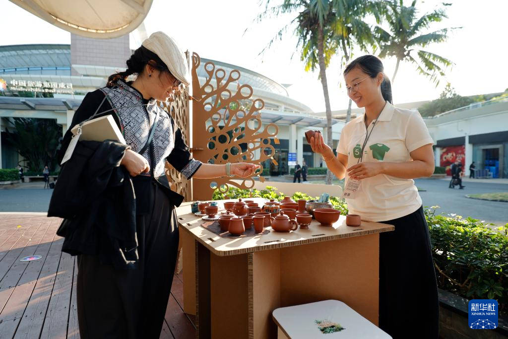 3月26日,在博鳌亚洲论坛2025年年会会场外的休息区,两名手艺人在整理陶艺展品。这里所用的桌椅都是由可再生纸制作的纸板制成。