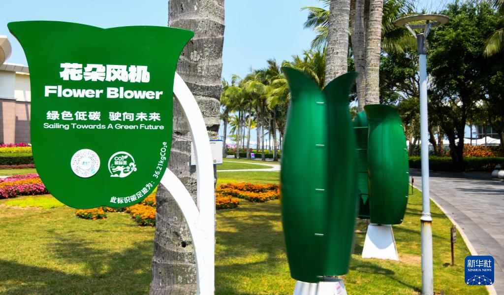 这是3月25日拍摄的博鳌零碳示范区内的花朵风机。花朵风机用来收集风能,是岛内可再生能源利用项目之一。