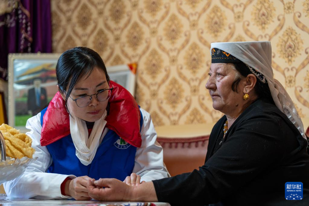 3月24日,在新疆塔县库科西鲁格乡瓦窑本村村民家中,深圳援疆中医康复科医生段静(左)为老人把脉。