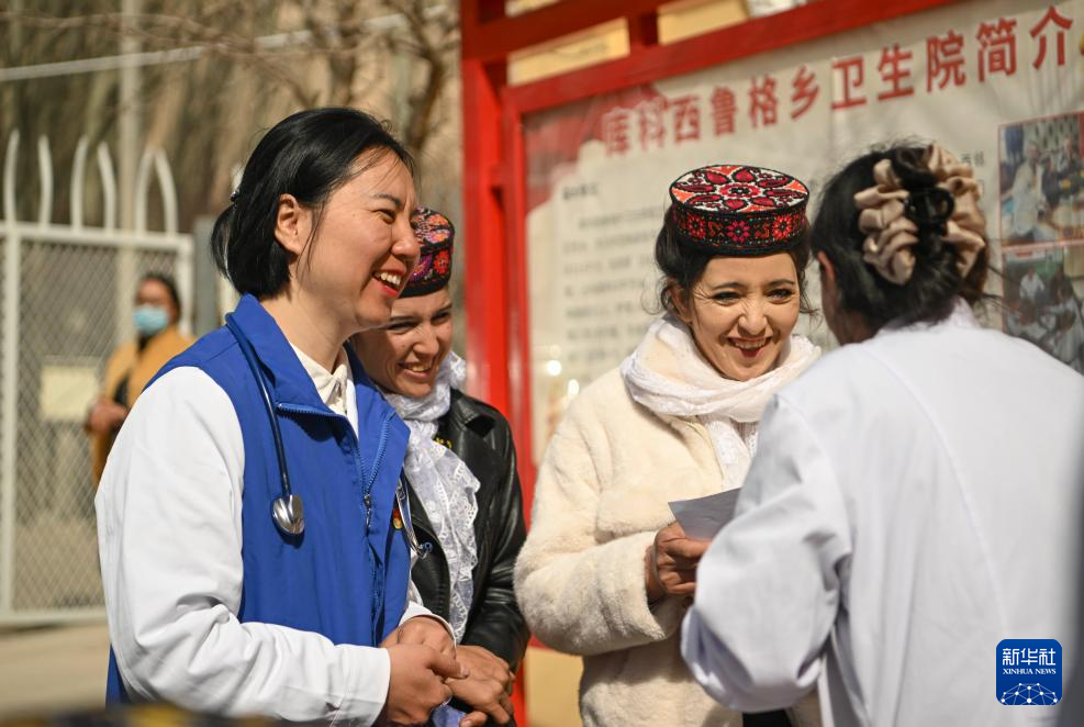 在新疆塔县库科西鲁格乡卫生院,深圳援疆新生儿科医生潘千(左一)与村民、乡卫生院医护人员交流(3月24日摄)。
