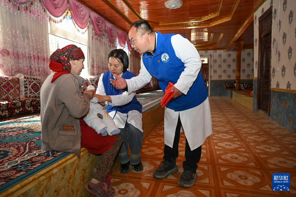 在新疆塔县库科西鲁格乡瓦窑本村,深圳援疆新生儿科医生潘千(中)与同事许林森(右)在村民家为新生儿检查身体,并叮嘱养护注意事项(3月24日摄)。