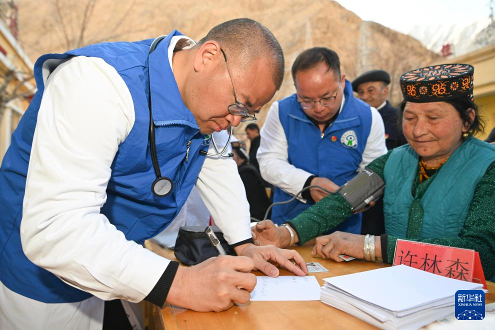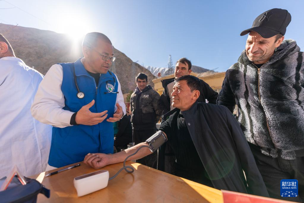 3月24日,在新疆塔县库科西鲁格乡卫生院,深圳援疆内科医生黄维超为村民测量血压。