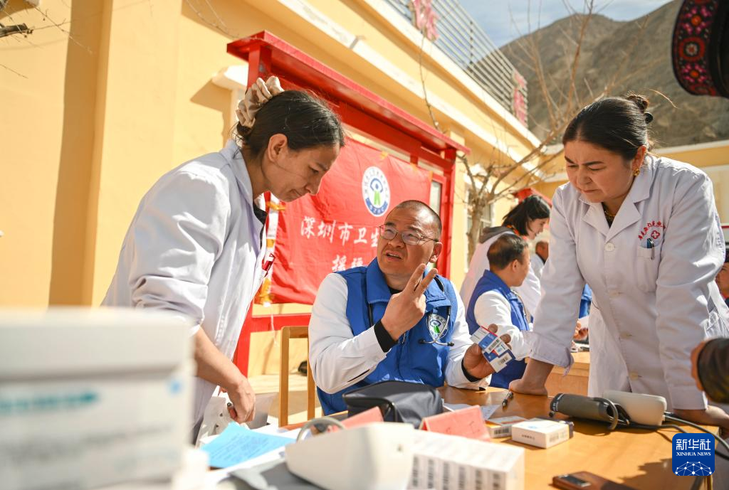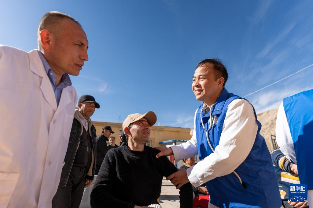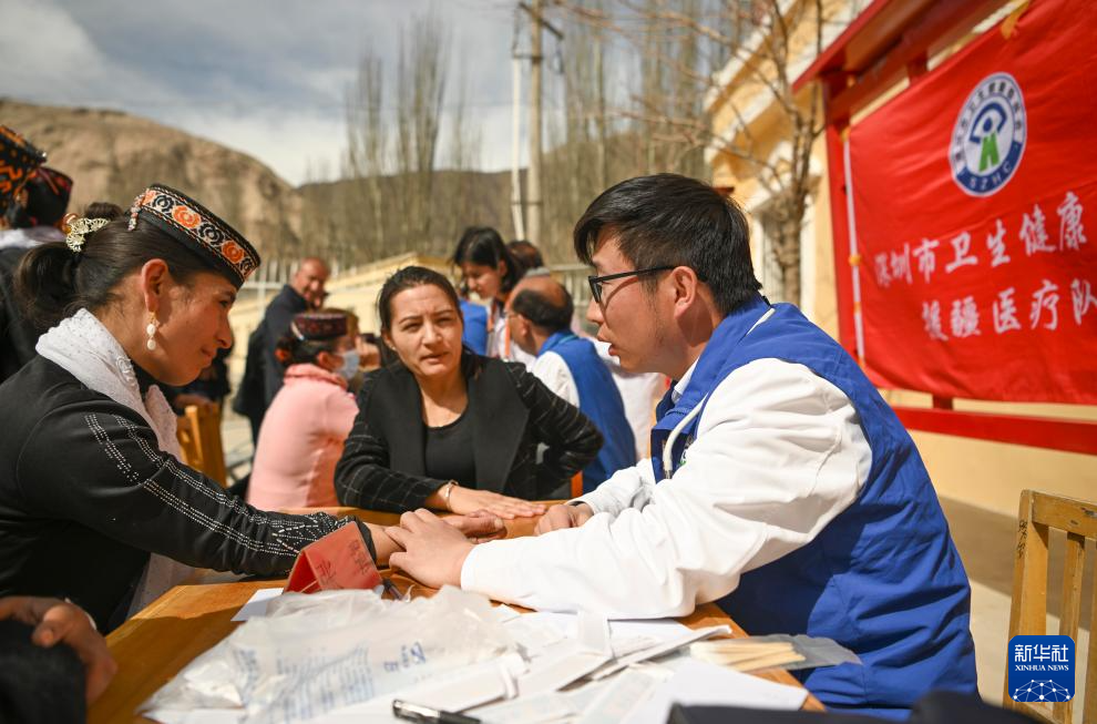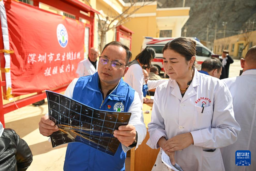3月24日,在新疆塔县库科西鲁格乡卫生院,深圳援疆外科医生刘金煌(右一)为村民检查身体。