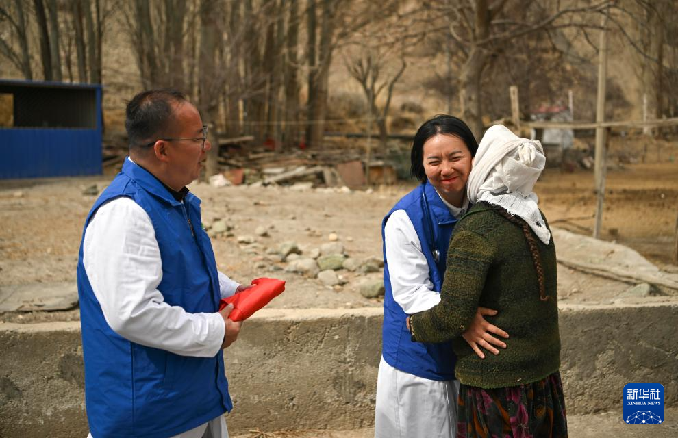 深圳援疆医生在新疆塔县库科西鲁格乡瓦窑本村送医上门,来访的医生潘千(中)和一位长者拥抱(3月24日摄)。