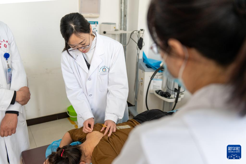 3月25日,在新疆塔县人民医院,深圳援疆中医康复科医生段静(中)为当地医生演示针灸治疗。