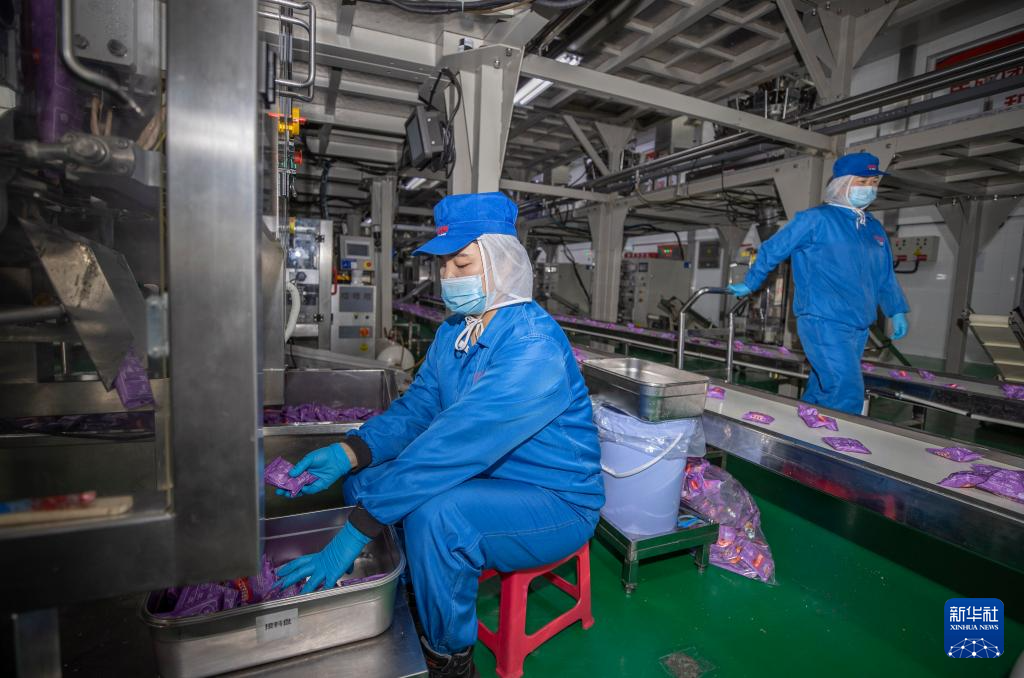 3月27日,在位于宁夏贺兰工业园区的宁夏厚生记食品有限公司智能化休闲食品加工车间内,工作人员包装产品。