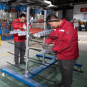 3月27日,在位于宁夏贺兰工业园区的汤姆森电气有限公司生产车间内,工作人员制作复合材料横担。