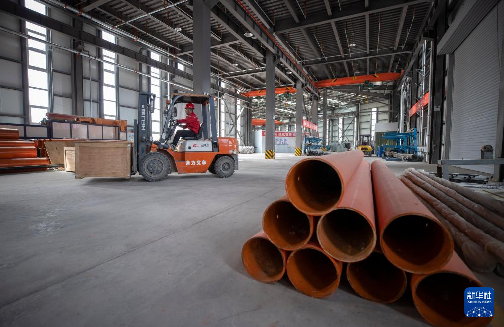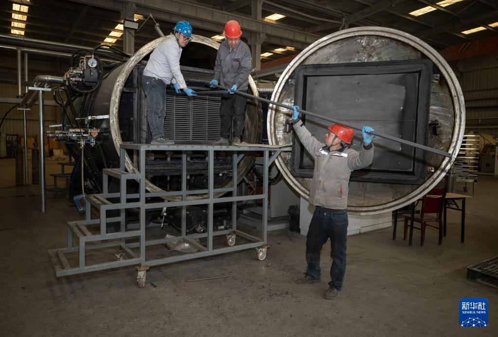 3月27日,在位于宁夏贺兰县暖泉工业园区的宁夏北伏科技有限公司挤出成型车间内,工作人员进行碳化硅陶瓷管出炉作业。