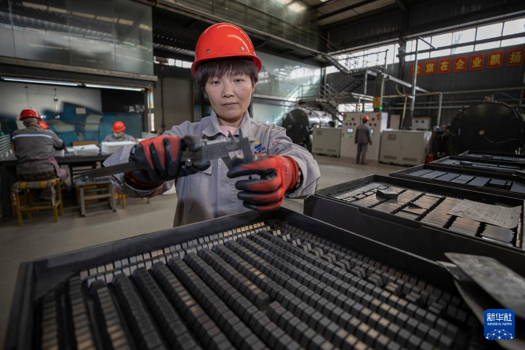 3月27日,在位于宁夏贺兰县暖泉工业园区的宁夏北伏科技有限公司制品车间内,工作人员检测烧制成型的碳化硅陶瓷产品。