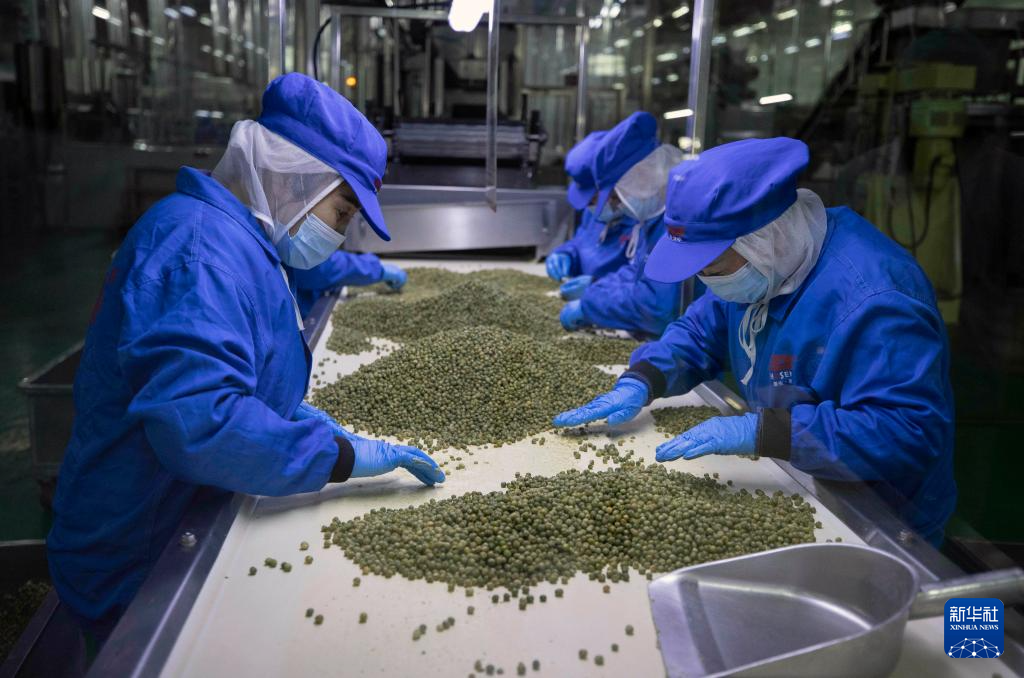 3月27日,在位于宁夏贺兰工业园区的宁夏厚生记食品有限公司智能化休闲食品加工车间内,工作人员分拣产品。