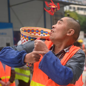 3月28日,在广西南宁市明秀东路一处建设工地,工作人员在唱山歌。
