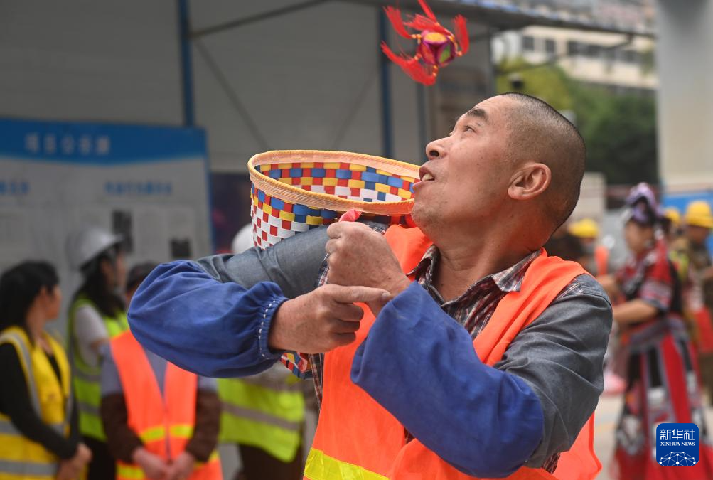 3月28日,在广西南宁市明秀东路一处建设工地,工作人员在接绣球。