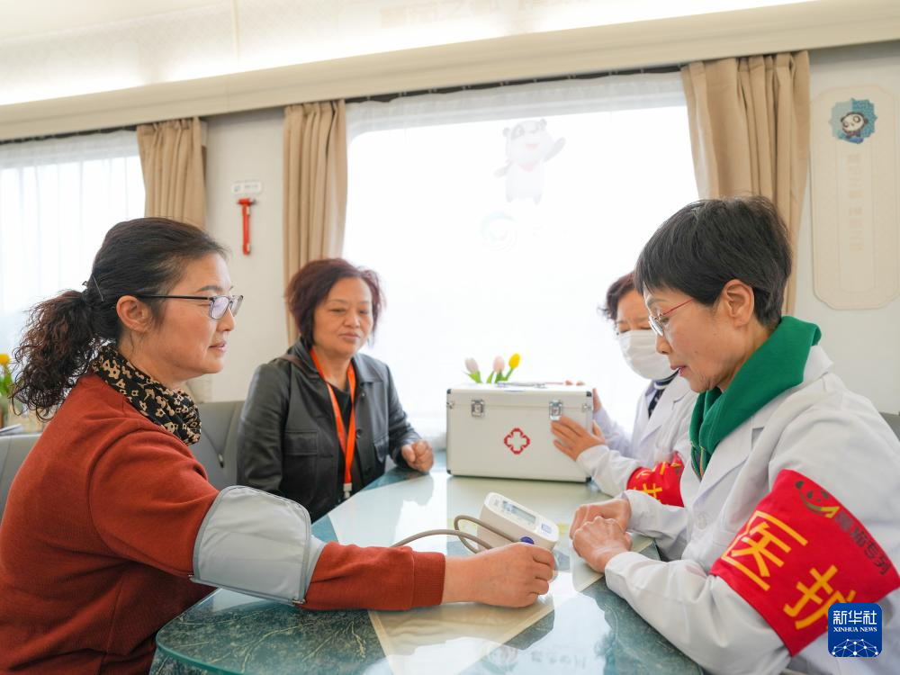 3月28日,在Y471次“熊猫专列·什邡号”列车上,医护人员为旅客测量血压。