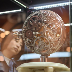 3月24日,天津海鸥表业集团员工在海鸥表博物馆内参观双陀飞轮机芯模型。