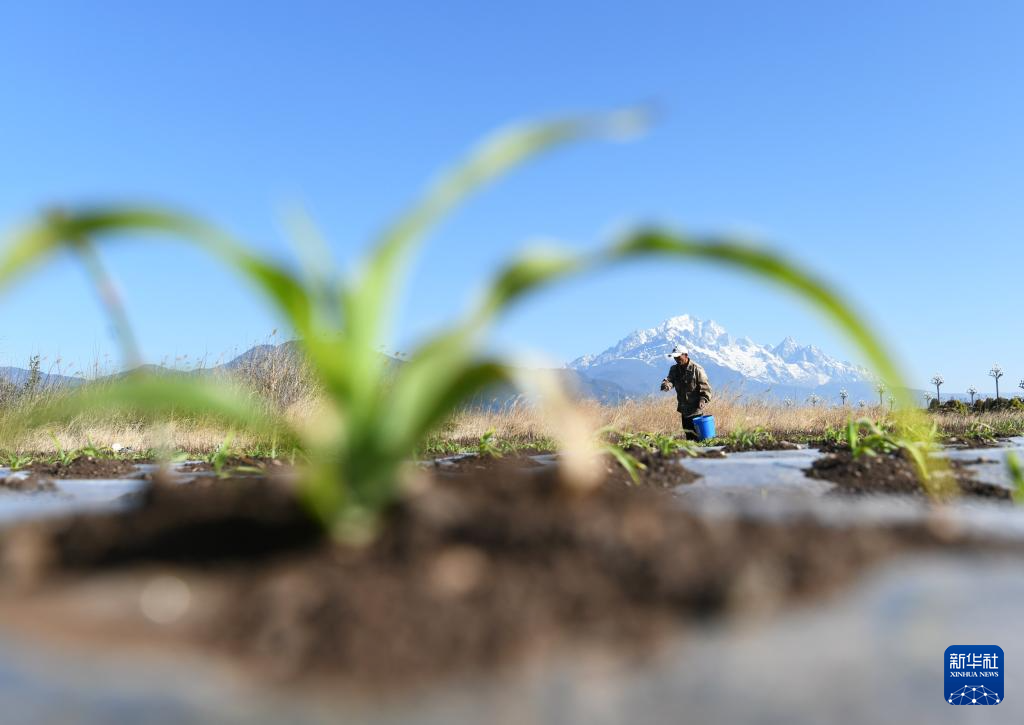3月27日,在云南省丽江市玉龙县黄山街道,农民在雪山脚下的田地里劳作。