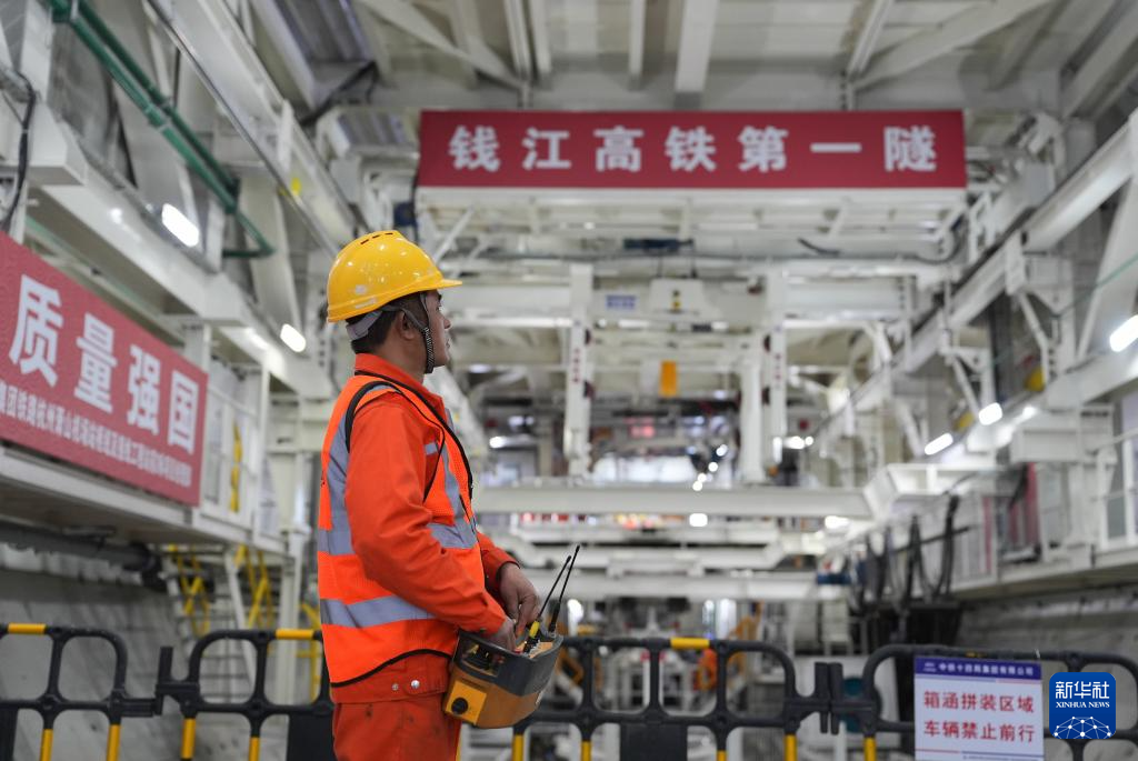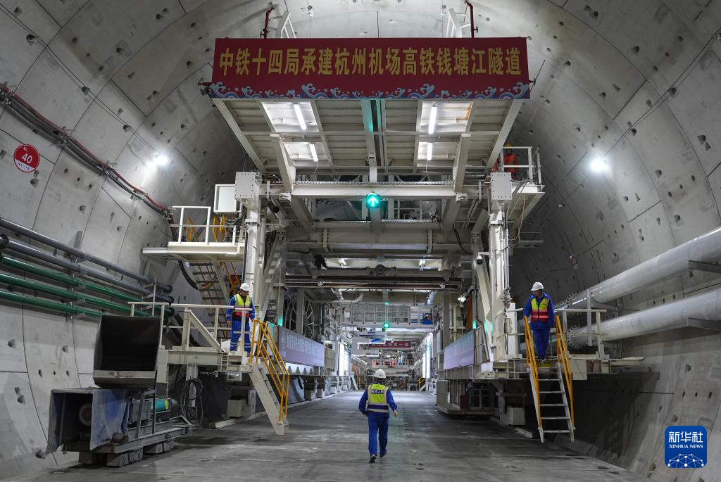 当日,在位于浙江海宁的新建杭州萧山机场站枢纽及接线工程钱塘江隧道施工现场,“钱塘号”盾构机持续掘进,工程建设稳步推进。