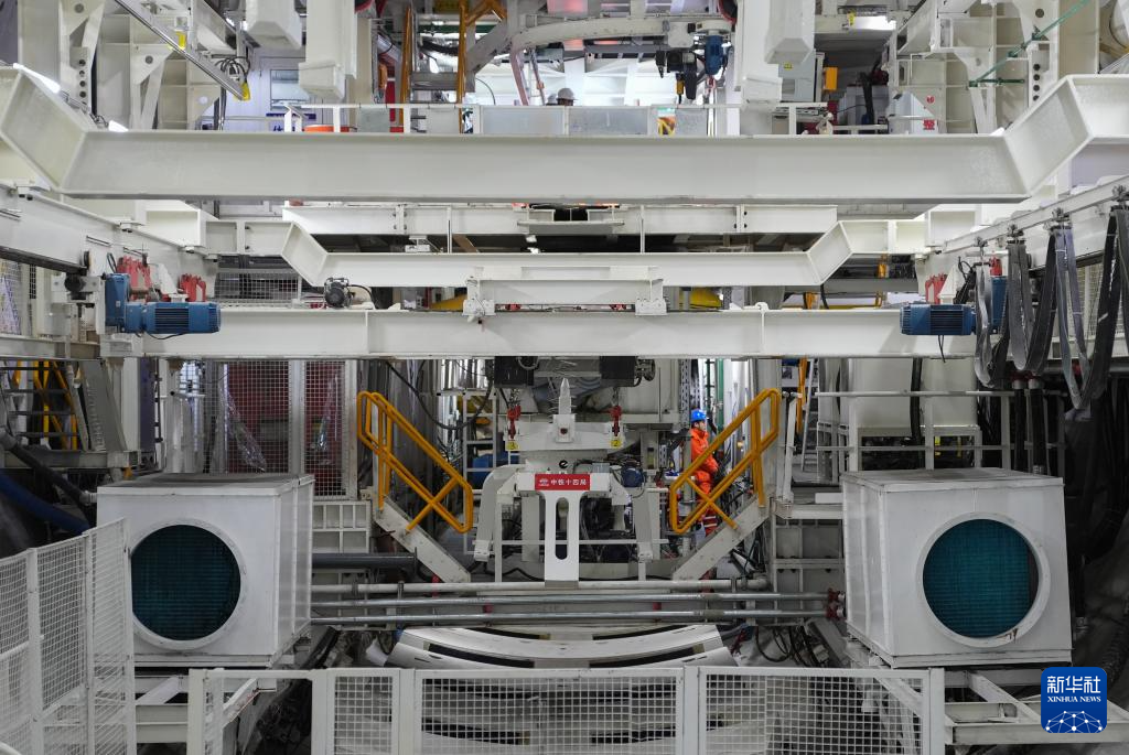 3月29日,中铁十四局技术人员在钱塘江隧道“钱塘号”盾构机内操作箱涵拼装设备。