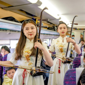 3月29日,扬州市文艺工作者在“水韵江苏”主题旅游列车上进行二胡演奏。