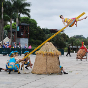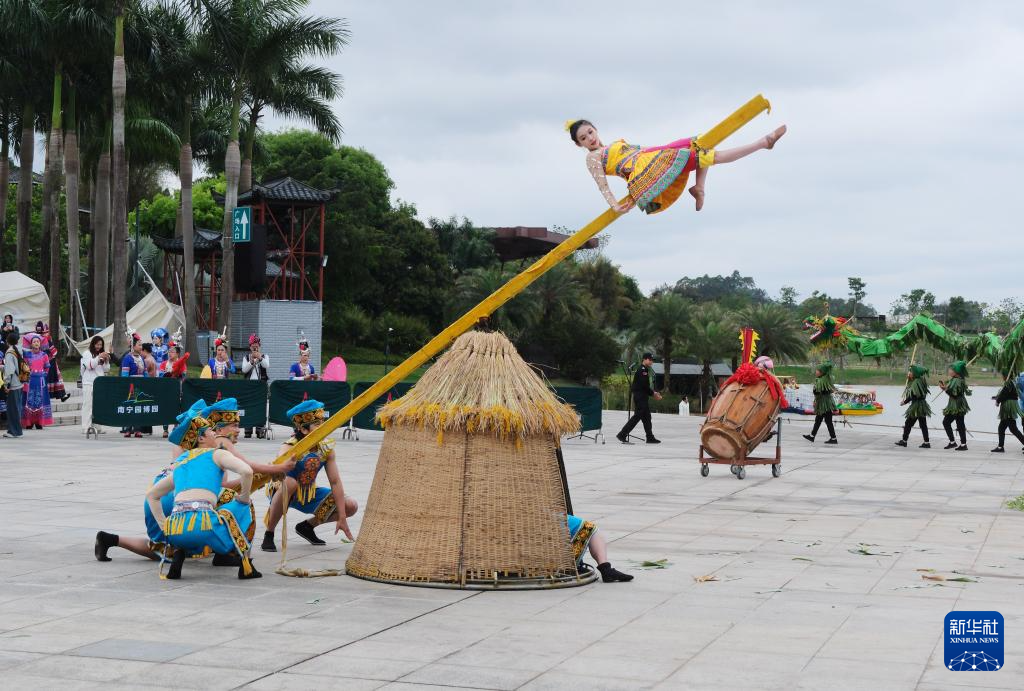 3月29日,演员在广西南宁园博园表演打磨秋。