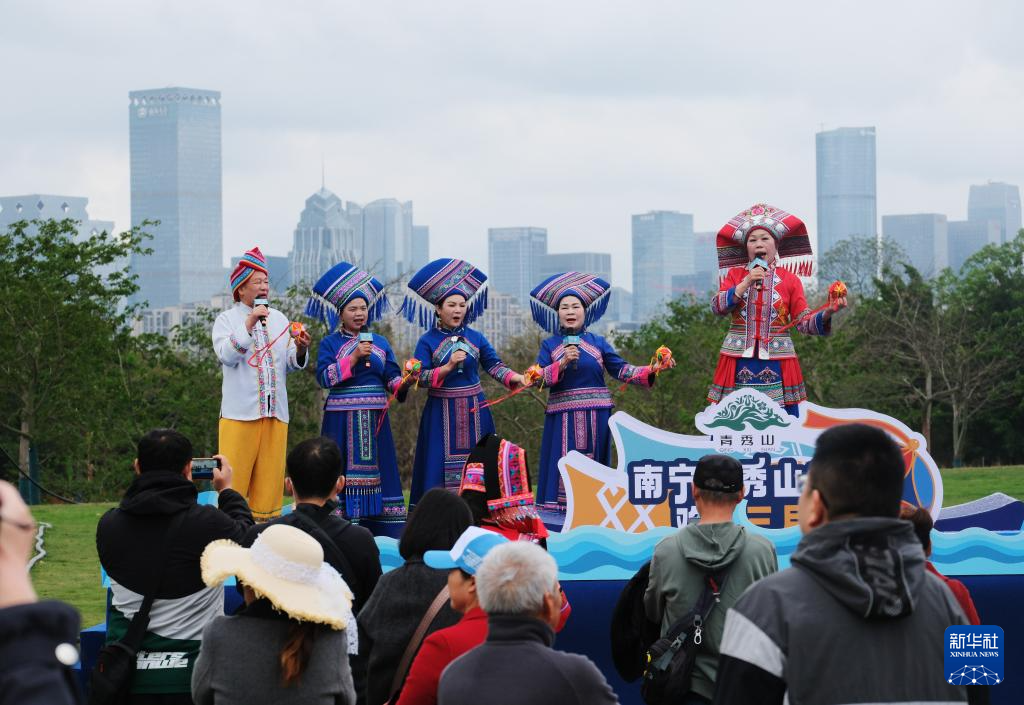 3月29日,演员在广西南宁市青秀山风景区唱山歌。