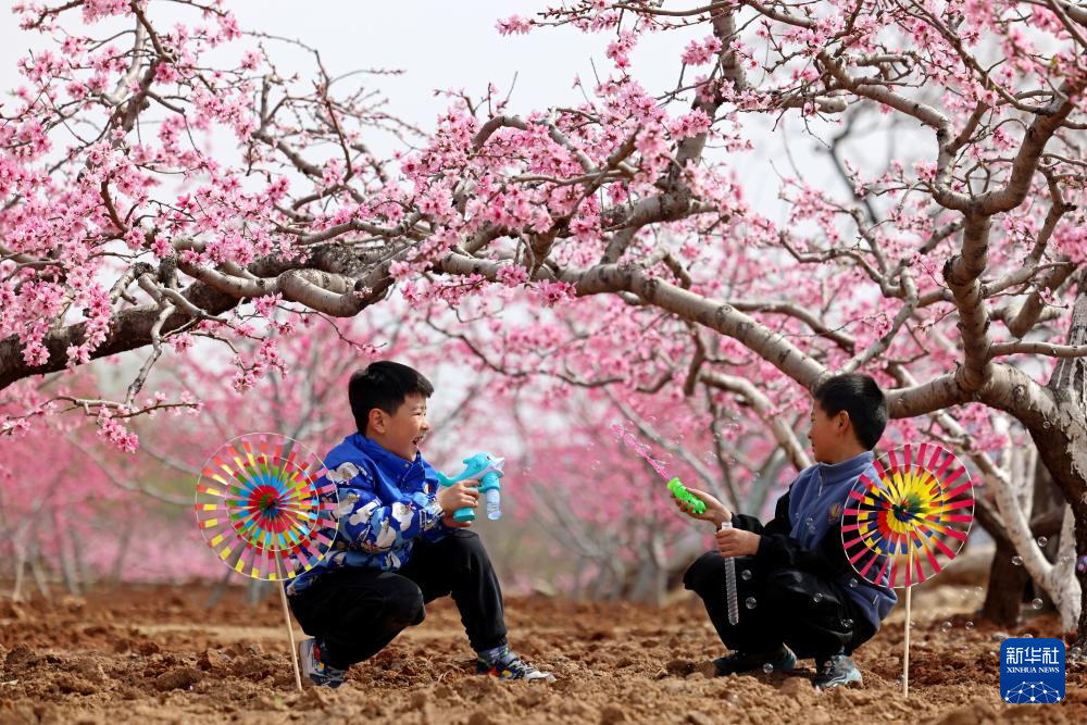 3月29日,小朋友在山东省枣庄市市中区孟庄镇桃花园里玩耍。