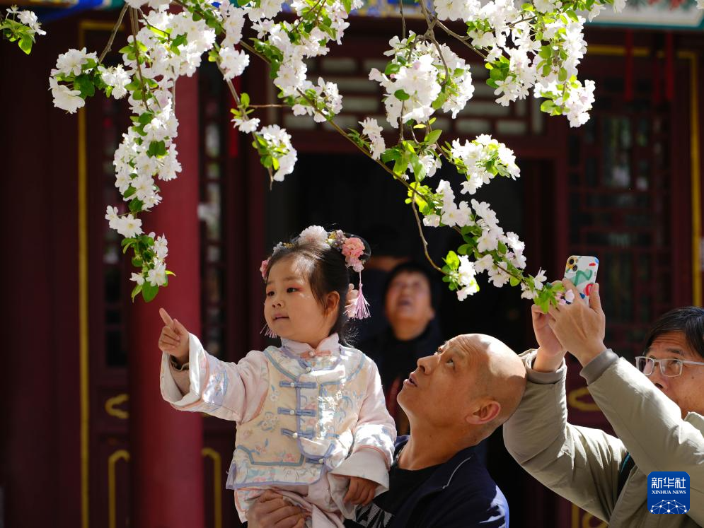 3月29日,游客在河北省石家庄市正定古城荣国府欣赏海棠花。