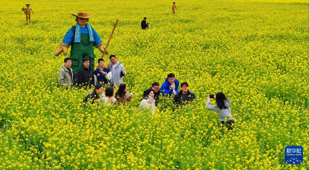 3月29日,在安徽省合肥市蜀山区小庙镇,游客在油菜花田里踏春游览(无人机照片)。