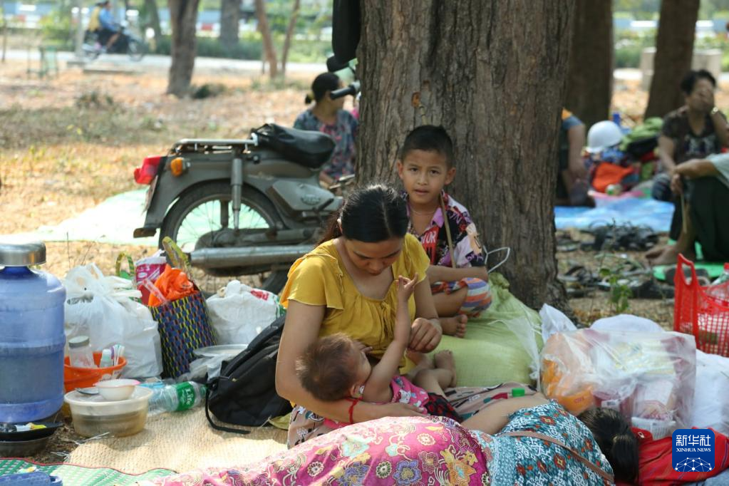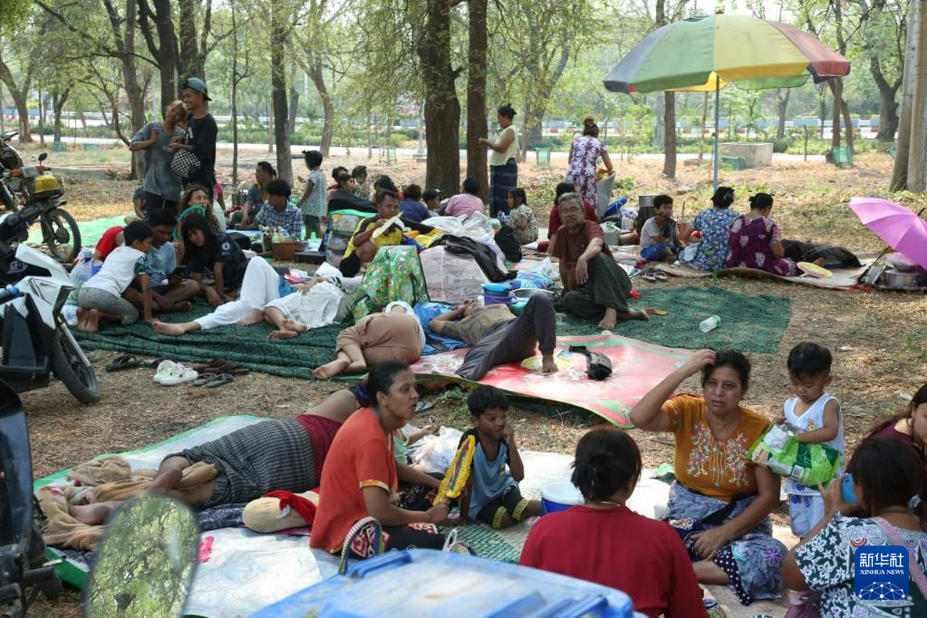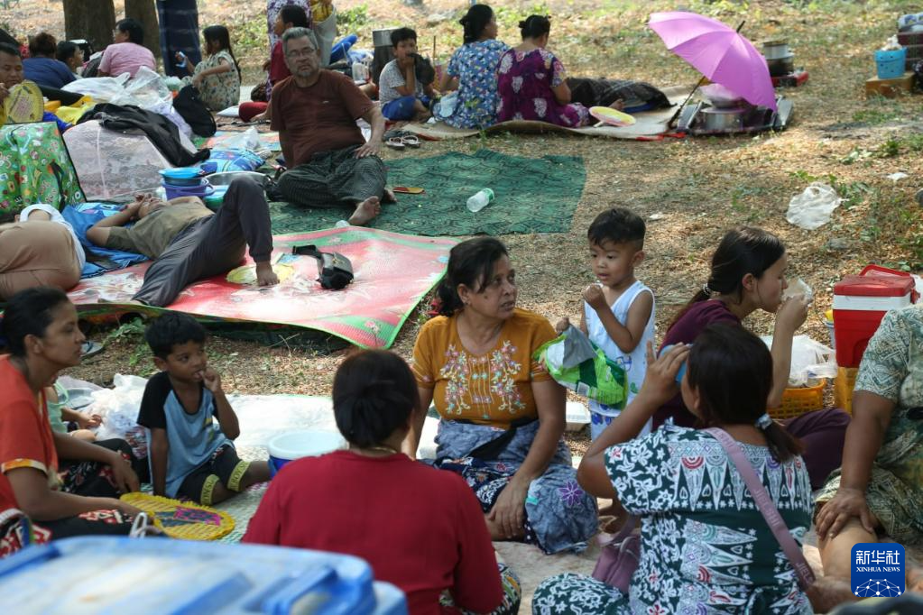 3月29日,在缅甸曼德勒,受灾民众在户外开阔地避险。