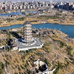 这是雄安新区金湖公园内的仿古建筑群(3月16日摄,无人机照片)。