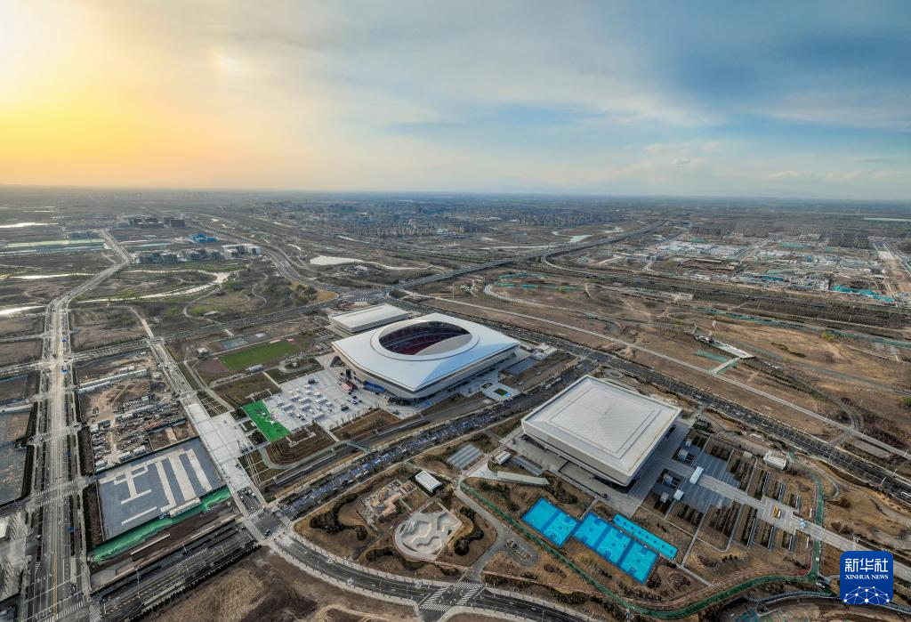 这是雄安体育中心(3月27日摄,无人机照片)。雄安体育中心的三座建筑形似三枚印章,体育场屋面呈现弧形,基座呈现方形,暗合“黄琮礼地”,方圆之间尽显中华风范。
