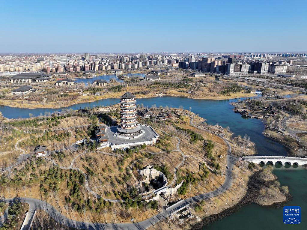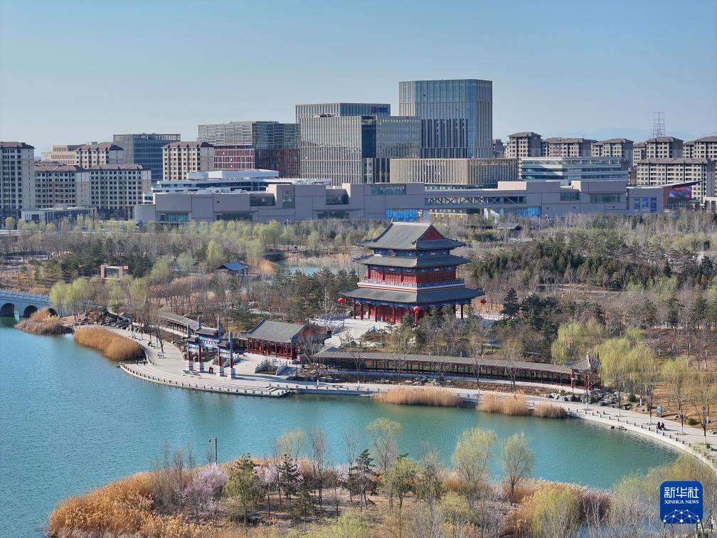 雄安新区悦容公园内的仿古建筑(3月16日摄,无人机照片)。