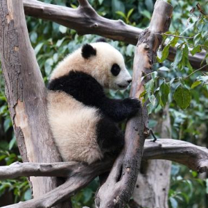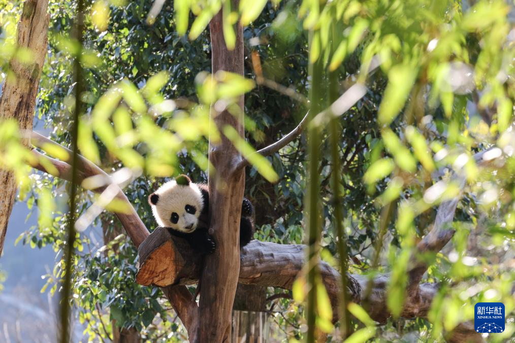 3月28日,在中国大熊猫保护研究中心卧龙神树坪基地,大熊猫幼崽在树上玩耍。