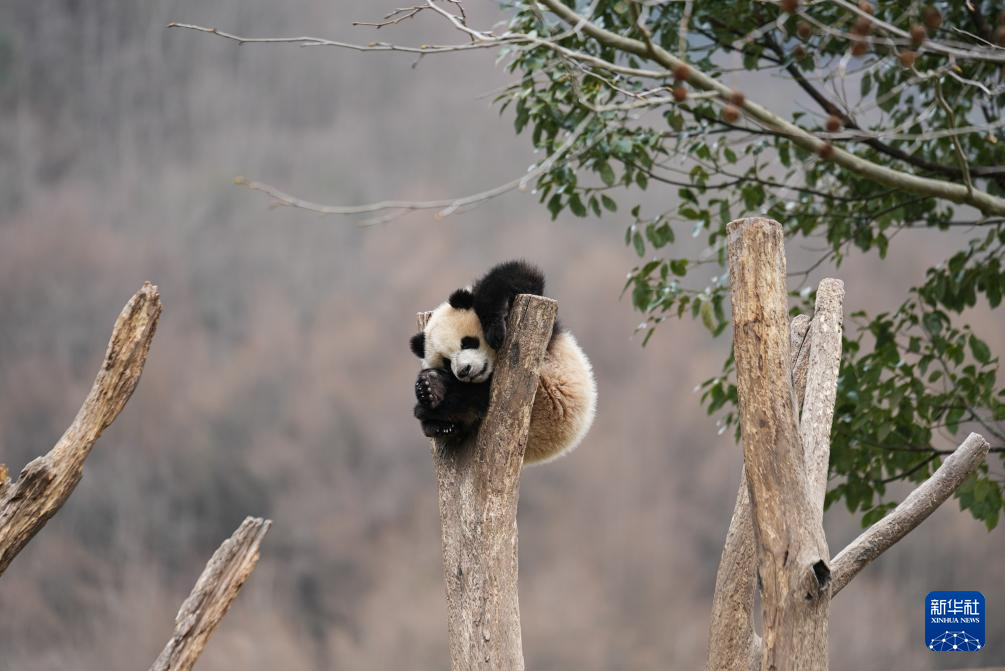 3月27日,在中国大熊猫保护研究中心卧龙神树坪基地,大熊猫幼崽在树上玩耍。