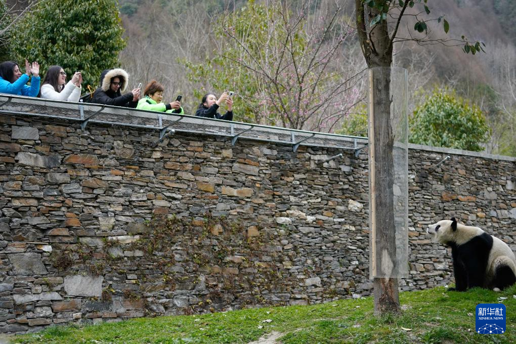 3月28日,在中国大熊猫保护研究中心卧龙神树坪基地,游客观看大熊猫“糯米”。